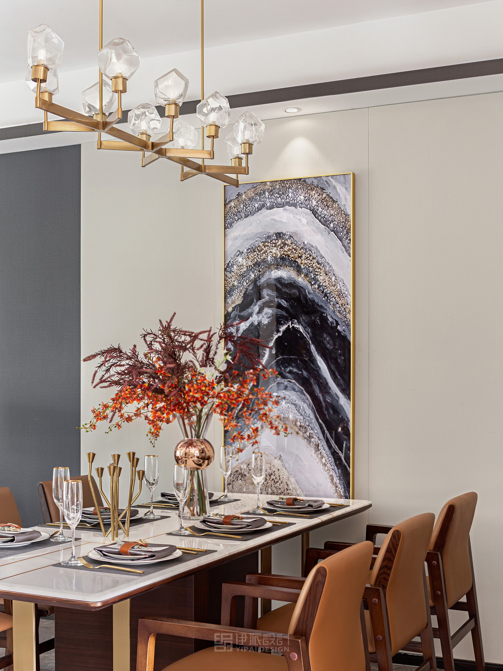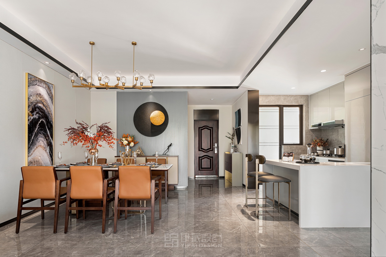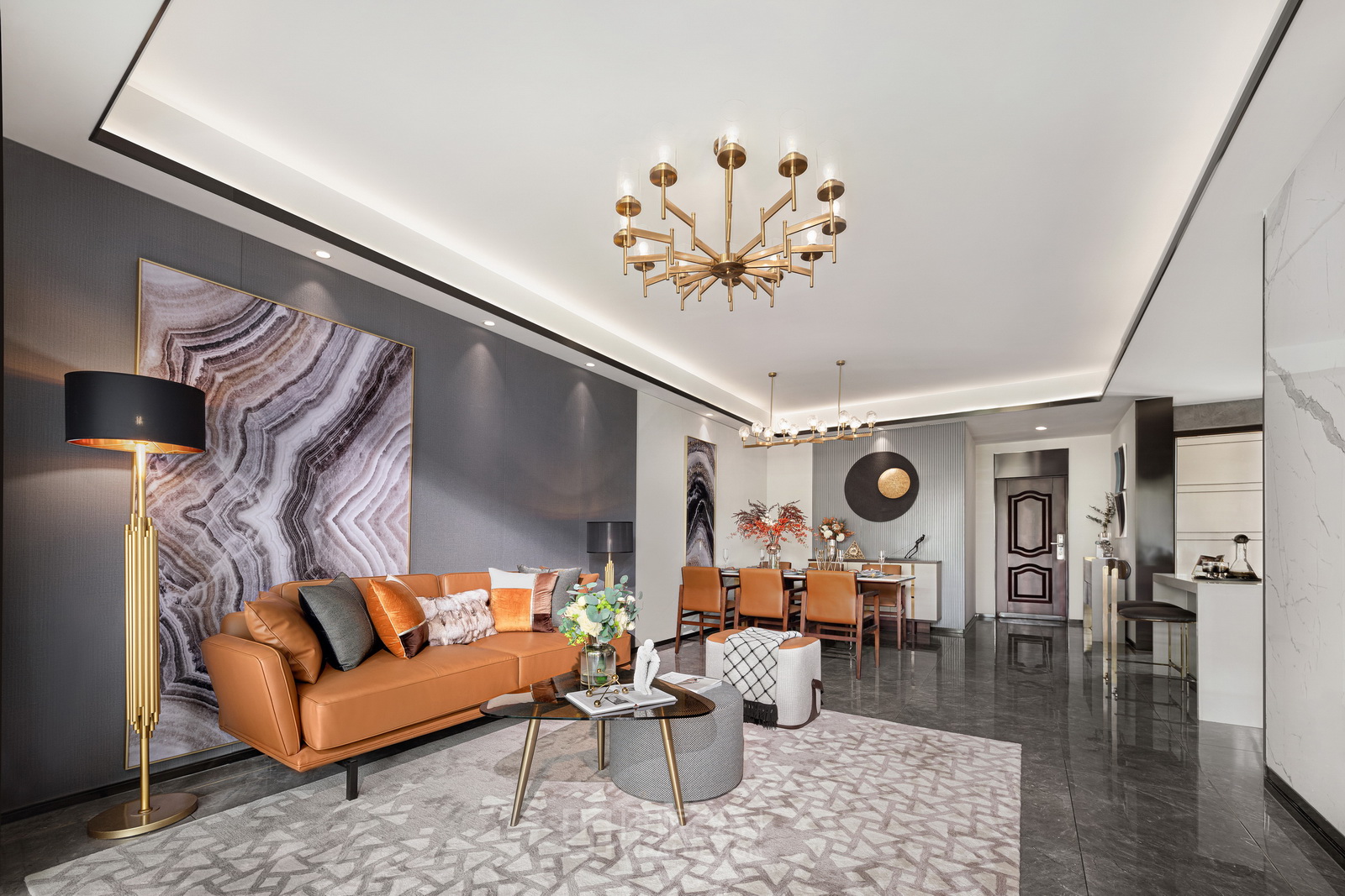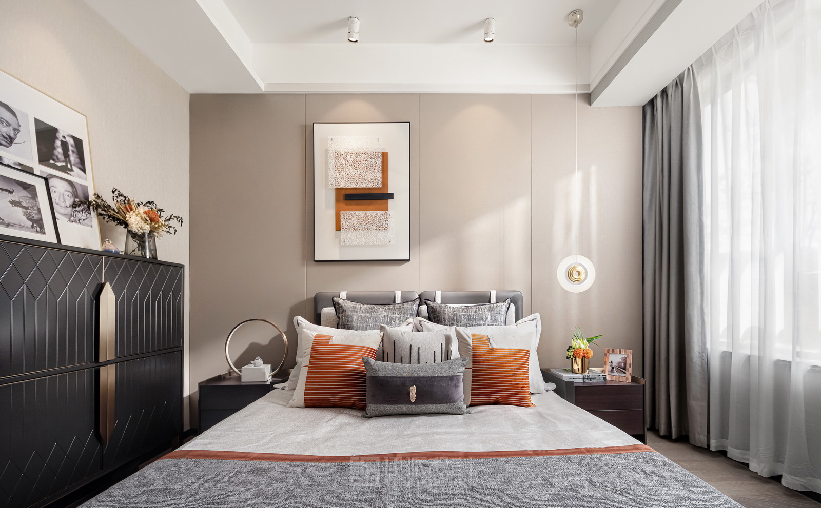 本案風(fēng)格為現(xiàn)代港式風(fēng)格,采用時(shí)尚精簡(jiǎn)、低調(diào)內(nèi)斂的高級(jí)灰是用于家居裝扮的首選基調(diào)色彩,呈現(xiàn)優(yōu)雅魅力和精致大氣的視覺感官,符合人們對(duì)現(xiàn)代生活的審美需求。同理,作為潮流都市代表色之一的暖橙,伊派設(shè)計(jì)在居家設(shè)計(jì)中的運(yùn)用中,讓空間張揚(yáng)不浮夸、經(jīng)典且時(shí)尚,成為永恒不變的奢侈品味。