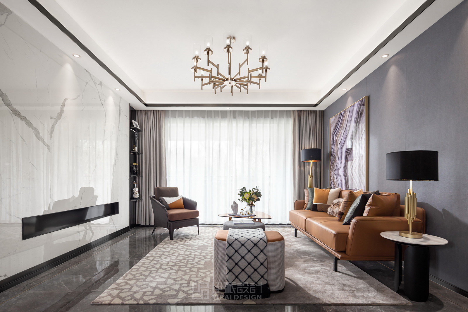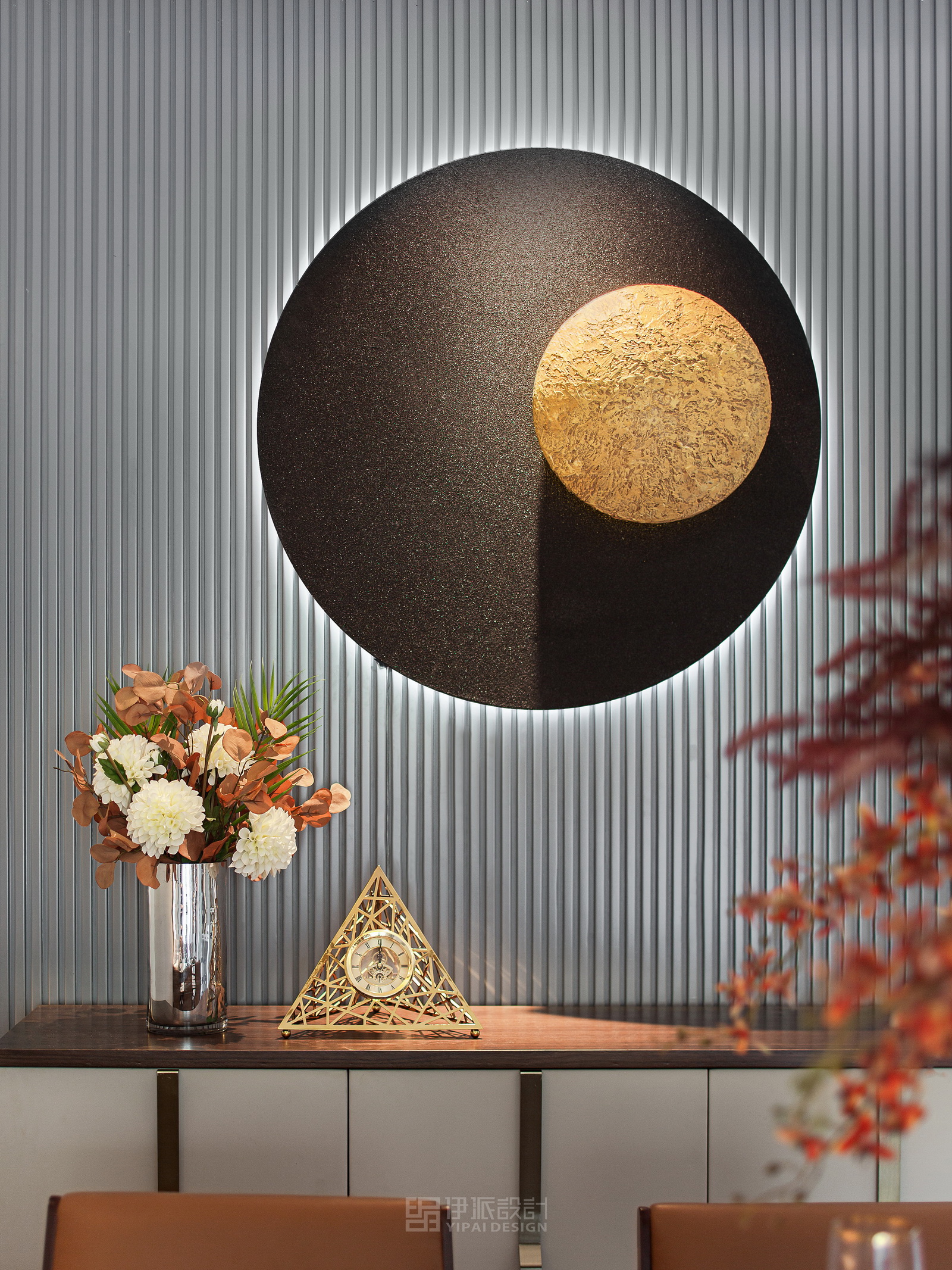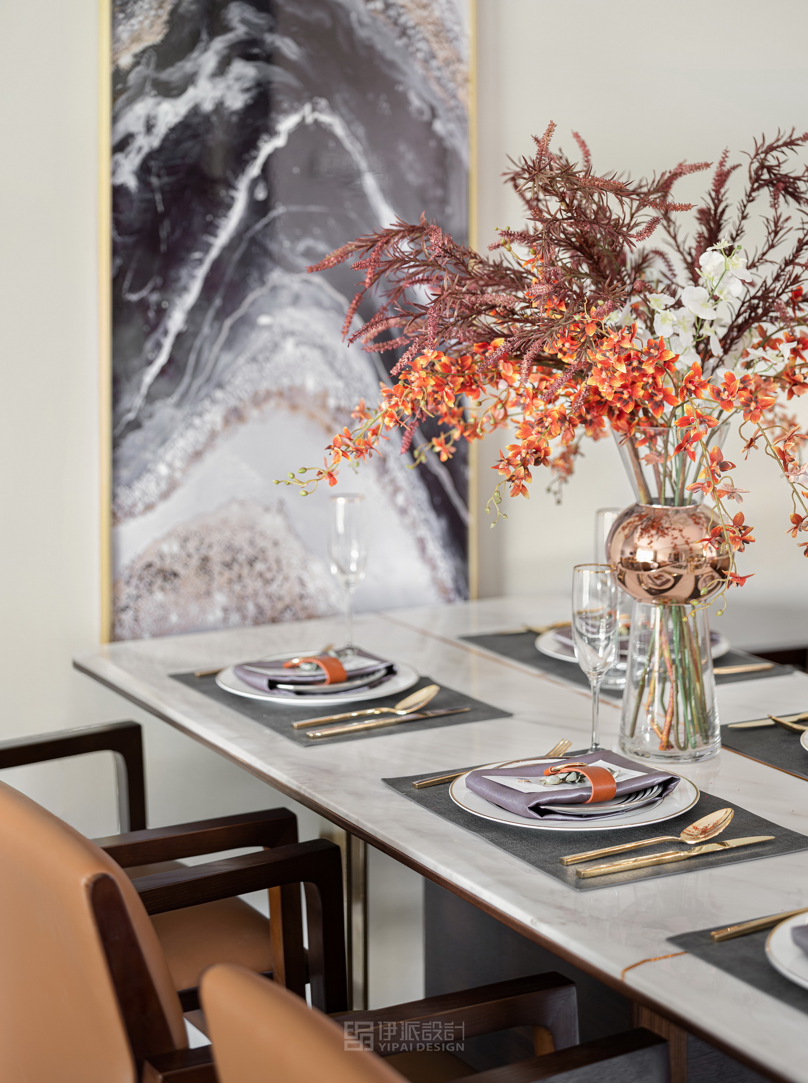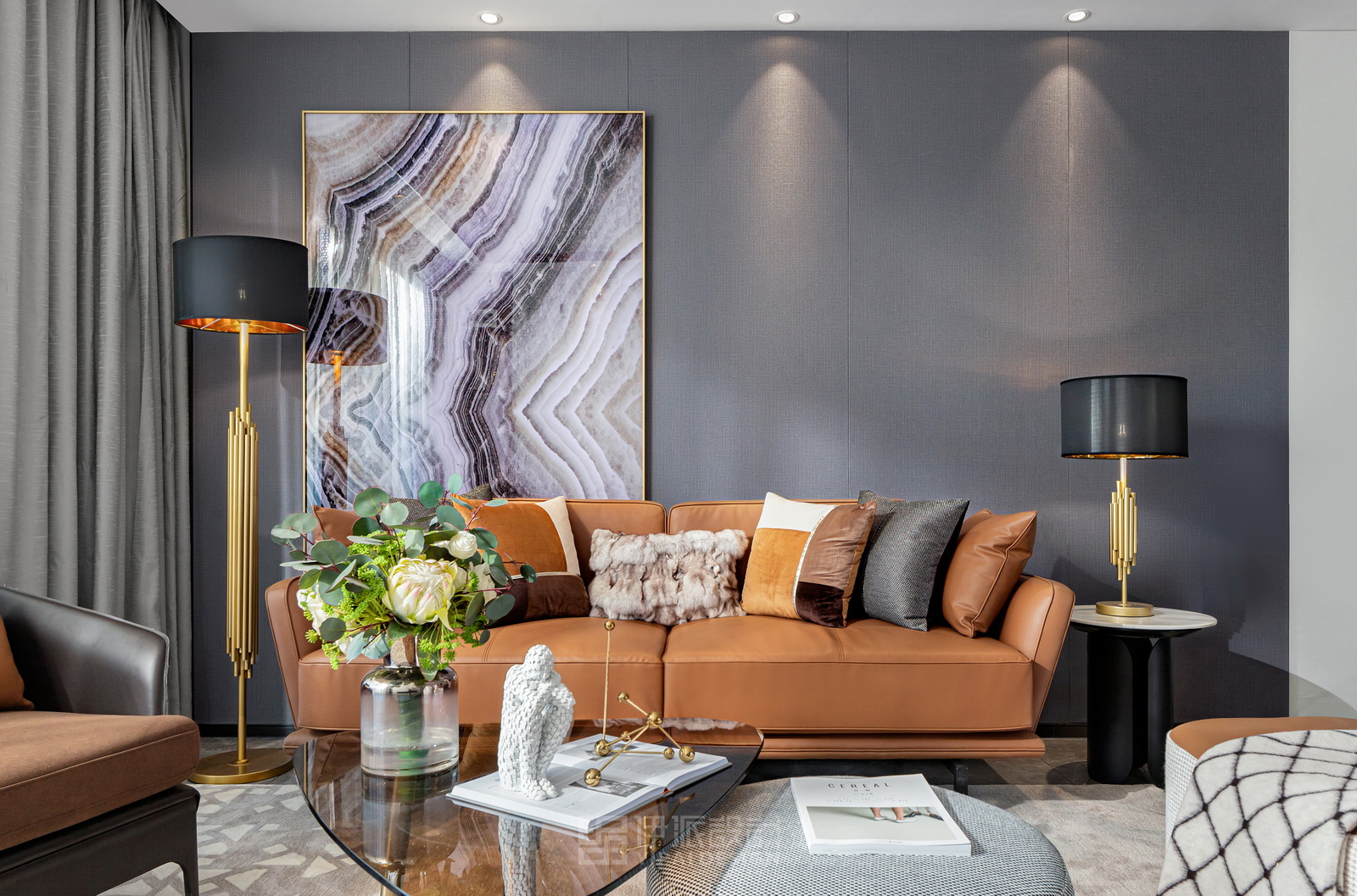 本案風(fēng)格為現(xiàn)代港式風(fēng)格,采用時(shí)尚精簡(jiǎn)、低調(diào)內(nèi)斂的高級(jí)灰是用于家居裝扮的首選基調(diào)色彩,呈現(xiàn)優(yōu)雅魅力和精致大氣的視覺感官,符合人們對(duì)現(xiàn)代生活的審美需求。同理,作為潮流都市代表色之一的暖橙,伊派設(shè)計(jì)在居家設(shè)計(jì)中的運(yùn)用中,讓空間張揚(yáng)不浮夸、經(jīng)典且時(shí)尚,成為永恒不變的奢侈品味。
