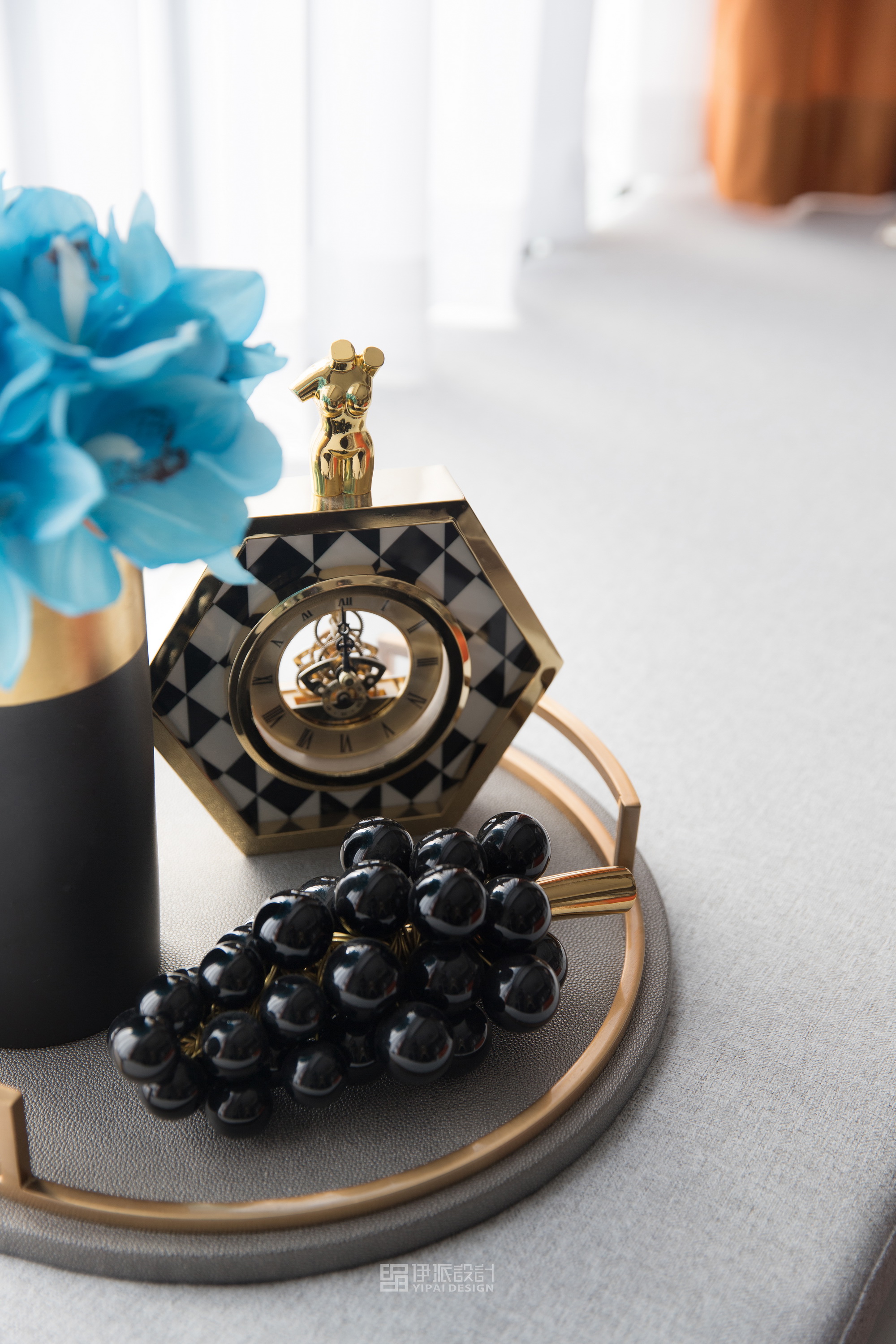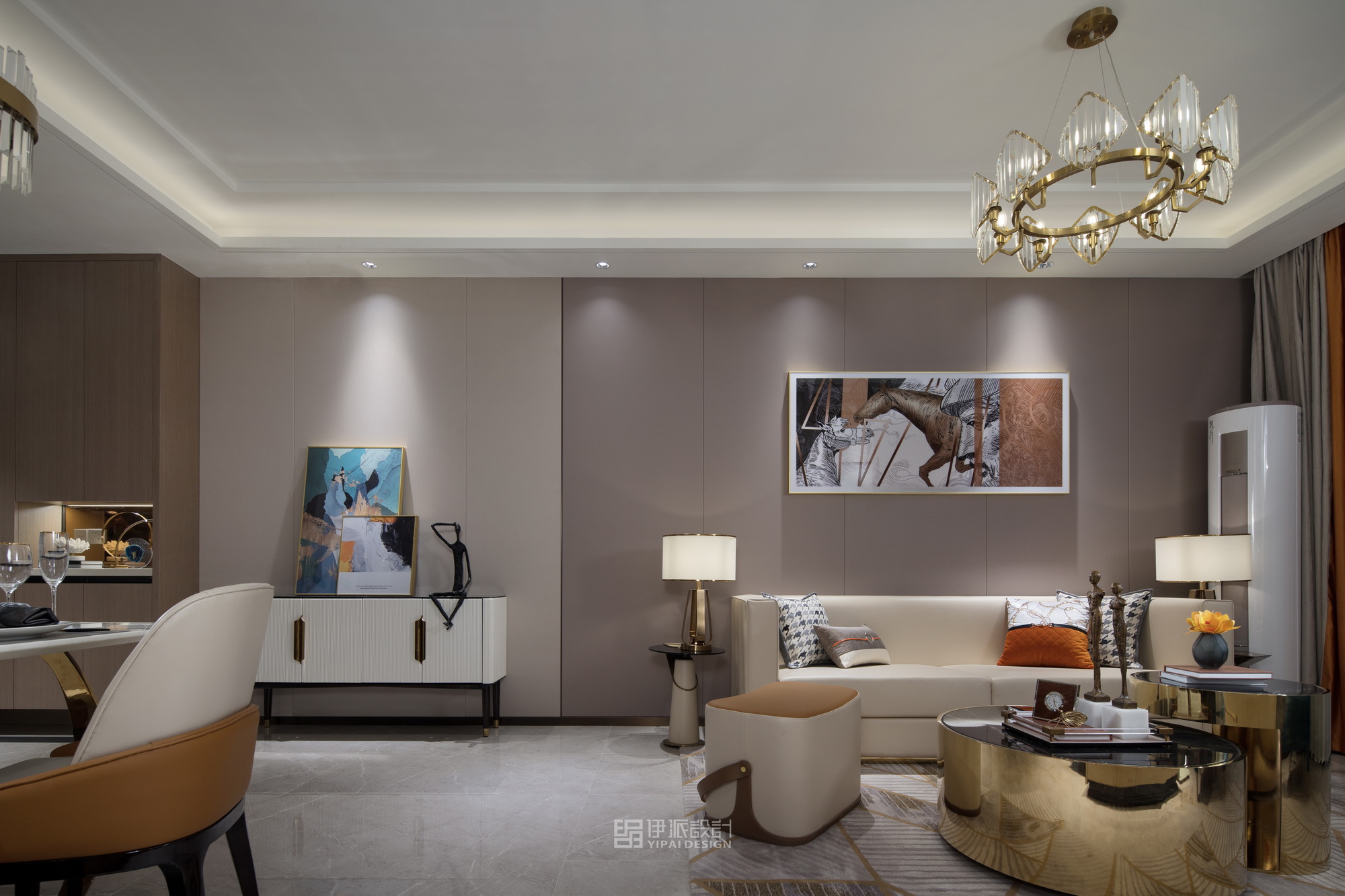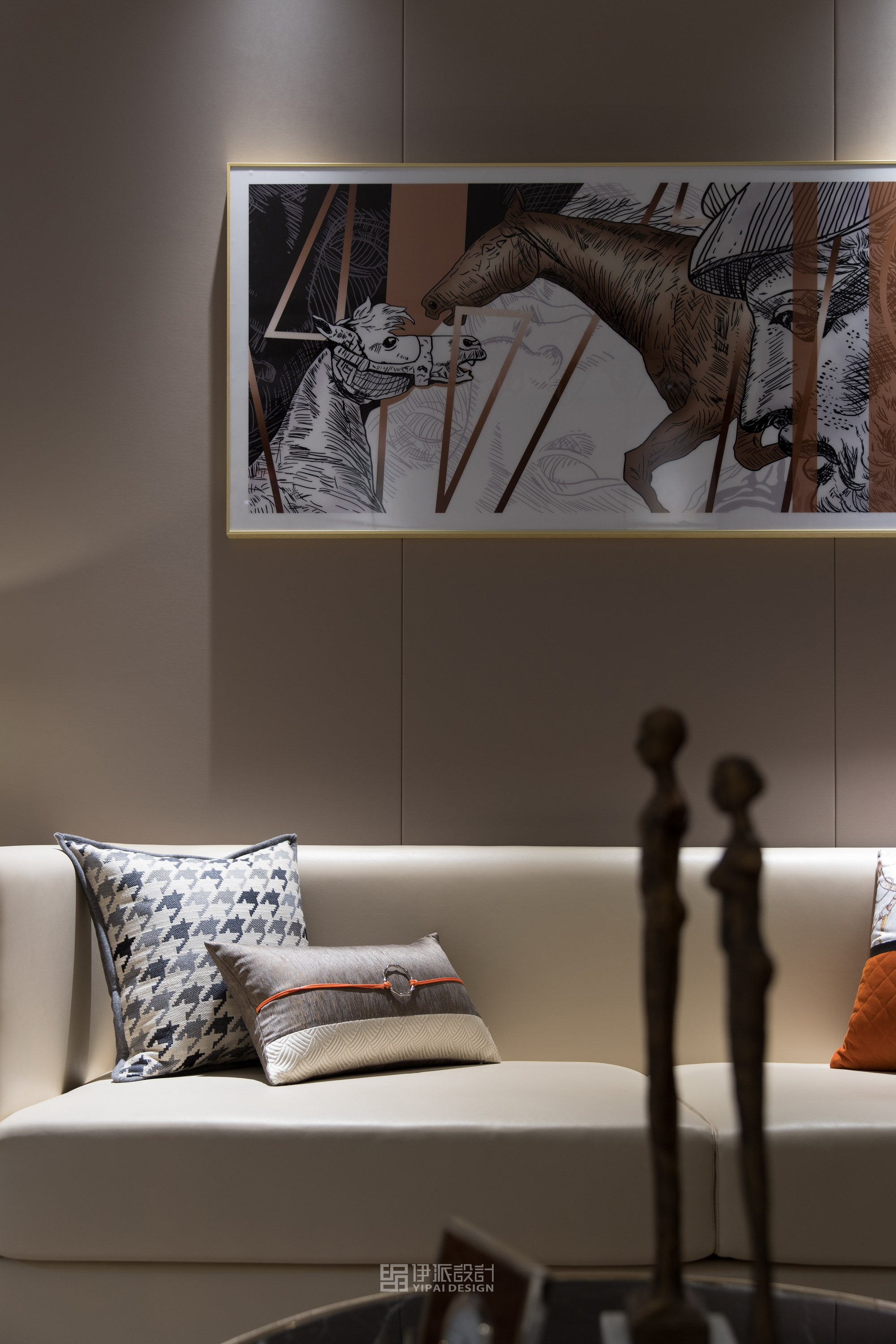 本案軟裝設計工程針對現(xiàn)代空間的美學思考,將上世紀的雕像與現(xiàn)代藝術,融合出獨具一格充滿西方氣息的藝術空間,神秘感縈繞其中,將“愛馬仕橙”作為設計核心,以港式輕奢的格調來定義空間的精神氣質,演繹品質高貴生活。